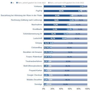 Wanneer u een Duitse webshop opricht, moet u zich ook bezig houden met betaalmethodes in Duitsland. Uit recent onderzoek van het E-commerce Center Handel (ECC) blijkt dat Duitse B2C webshops hun klanten gemiddeld 5,5 verschillende betaalmethodes ter beschikking stellen. In 2009 waren dat er gemiddeld nog maar 4,4.