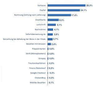 Wanneer er vervolgens gekeken wordt naar welke omzet Duitse webshops met de verschillende betaalmethodes maken, dan blijkt dat Duitse webshops de meeste betalingen ontvangen middels een betaling vooraf (Vorkasse, 28,3%), gevolgd door PayPal (24,1%) en betaling achteraf na levering en ontvangst van de factuur (Rechnung, Zahlung nach Lieferung, 17,4%). In opkomst is de betaalmethode Sofortüberweisung.de, in Nederland DirectEbanking genaamd, een bedrijf dat het meest op het Nederlandse iDeal lijkt.